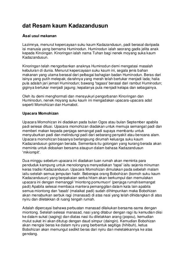 Adat resam kaum kadazan dusun from image.slidesharecdn.com Majlis ini diadakan pada hari enam belas kelahiran bayi. Kaum bajau merupakan kaum bumiputra kedua terbesar di negeri sabah. Bagi kaum bajau apabila seseorang itu meninggal dunia, doa akan dibacakan dan mayat si mati ditutup dengan kain. Adat resam ini ada pelbagai jenis contoh nya perkhawinan pihak lelaki akan menghantar cincin selepas pihak perampuan memberi jawapan samada mereka setuju atau tidak kalau mereka setuju barulah pihak lelaki menghantar. Namun terdapat adat resam tempatan yang ditambah. 27 adat resam dan pantang larang melayu, orang masih buat lagi ke? Kaum ini mempunyai pelbagai dialek dengan kebudaya a n dan adat resam tradisional. Adat resam kaum iban secara tradisi kehidupan masyarakat iban diatur oleh adat mereka yang amat rapat berkait dengan sostem pertanian berhuma (bumai) padi.