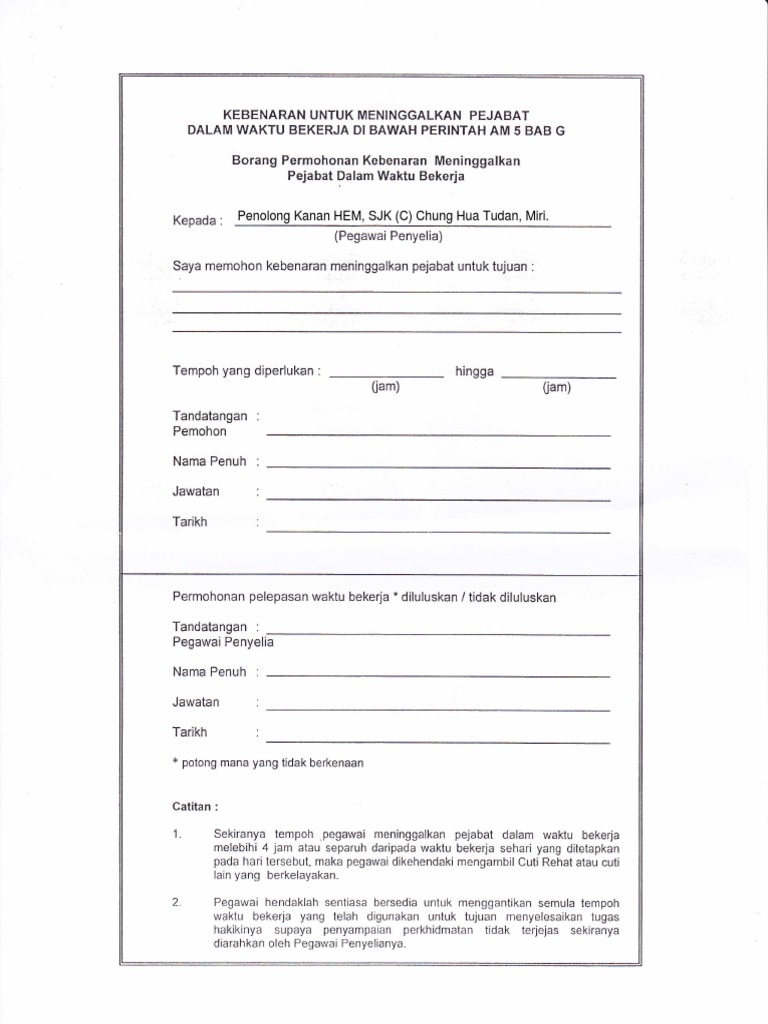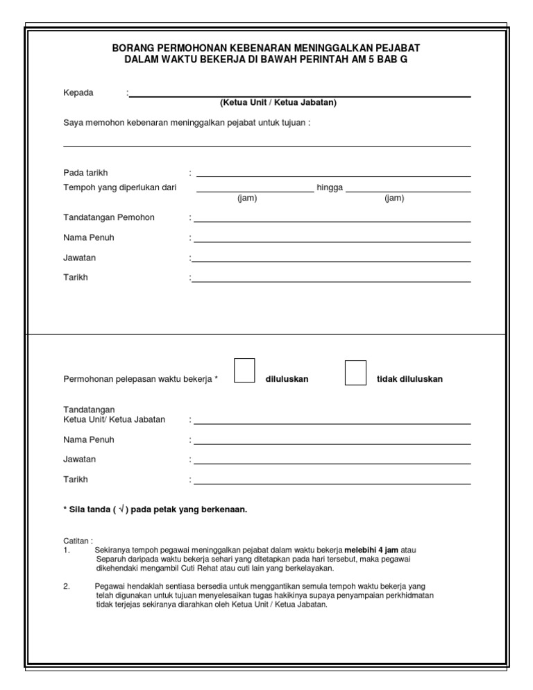 Kebenaran Untuk Meninggalkan Pejabat View2011 02 02kebenaran Untuk Meninggalkan Pejabat Dalam Waktu Bekerja Di Bawah Perintah Am 5 Bab G Sekiranya Tempoh Staf Meninggalkan Pejabat Doc Document from reader020.staticloud.net Perintah am bab a, b, c, d, e, f dan g— transcript presentasi 4 syarat am lantikan warganegara untuk lantikan tetap umur tidak kurang daripada 18. So please help us by uploading 1 new document or like us to download To view this presentation, you'll need to allow flash. Perkhidmatan bilangan 1 tahun 1980. We are a sharing community. Panduan perbendaharaan tatacara pengurusan stor ; Silakan di tonton video tentang sebuah artikel perintah am bab c cuti pegawai awam pembentangan kumpulan 7. Untuk memudahkan anda, perubahan sop yang telah dibuat oleh pihak kerajaan telah ditanda dengan **.