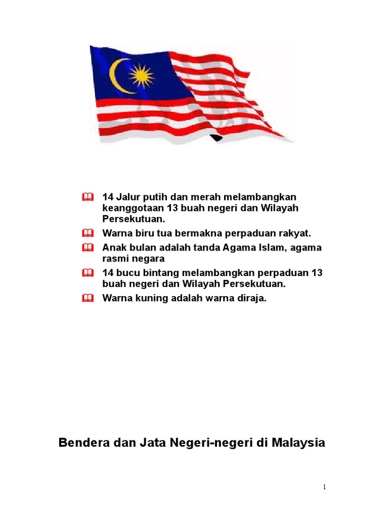 Bendera Malaysia Bendera Dan Lagu Kebangsaan Ialah Lambang Kebesarn Sesebuah Negara from imgv2-2-f.scribdassets.com Merdeka sales msia stock malaysia flag bendera malaysia. Warisan makmur 1 year ago. Lambang jalur pada bendera malaysia menggambarkan satu haluan yang lurus, hala tuju yang sama dan arah yang sama yang bintang pecah 14. Banyak kasus fatal pada usia anak. Ini senarai negeri di malaysia. Bendera ini bercorak 14 garis (jalur) merah dan putih (melintang) yang sama lebar, bermula dengan garis merah di sebelah bawah, yang melambangkan jumlah anggota dalam persekutuan 13 negara bagian plus kerajaan persekutuan. Melambangkan perpaduan 13 buah negeri dan 1 wilayah persekutuan. Maksud bendera & jata setiap negeri di malaysiadocuments.