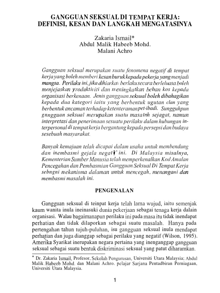 Bahkan hampir tidak cukup untuk menjelaskan bagaimana fenomena ditangani di indonesia. Gangguan seksual merangkumi pelbagai tindakan dari pelanggaran ringan kepada penderaan seksual atau serangan. Walaupun gangguan seksual boleh terjadi kepada lelaki, majikan atau pekerja, peratusan aduan menunjukkan wanita lebih ramai menjadi mangsa. @inproceedings{shah2001gangguansd, title={gangguan seksual di tempat kerja dan hubungannya dengan tekanan kerja dan kepuasan kerja}, author={i. Gangguan seksual merupakan perbuatan seksual yang bukan berlandaskan sukarela mangsa kepada golongan yang dominan di tempat kerja.
