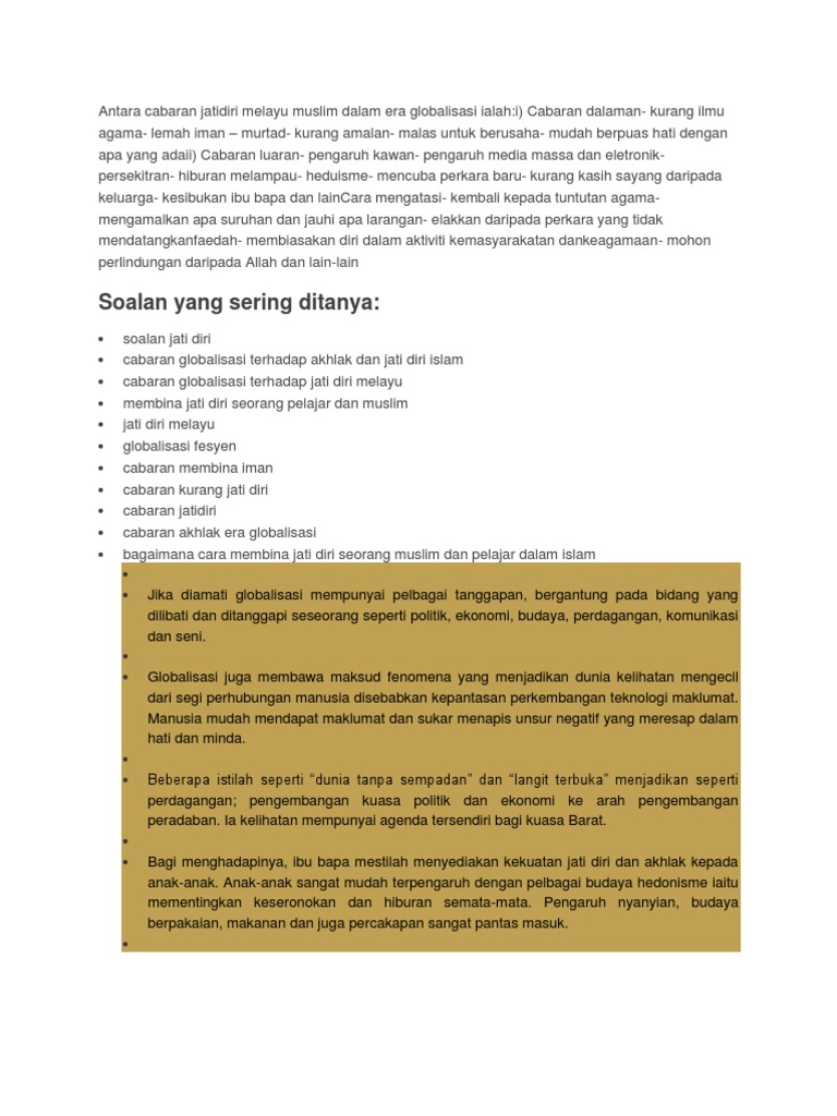 Pdf Cabaran Globalisasi Dalam Memahami Keperluan Waqi Kehidupan Dan Pendidikan Islam Satu Sorotan from i1.rgstatic.net Bahasa inggeris digunakan untuk perhubungan secara global. Dalam arus era globalisasi ini, kebersihan menjadi salah satu elemen utama yang membawa kepada pelbagai jenis jangkitan di seluruh dunia. Budaya muzik dan hiburan cth: Saban hari, kita telah dinasihatkan supaya menjaga kebersihan diri agar kita tidak mudah dijangkiti penyakit. Di mana makna budaya tersebut nantinya akan dipindahkan ke produk dan jasa, dan produk kemudian dipindahkan ke konsumen. May 22, 2013 · pengaruh budaya terhadap perilaku konsumen, dapat dilihat dari produk dan jasa memainkan peranan yang sangat penting dalam mempengaruhi budaya karena produk mampu membawa pesan makna budaya. Disneyland diadakan di kebanyakan negara. Aug 21, 2017 · jika kita mahu tetap menganggapnya sebagai sebuah khazanah warisan budaya yang berharga, tentu setiap virus yang dibawa oleh globalisasi yang memungkinkan memberi impak apa jua bentuk kemerosotan kepada bahasa melayu akan dihindari dan diusahakan mencari jalan cara penyelesaianya kerana kewibawaan atau kekukuhan sesebuah bahasa itu sangat erat.
